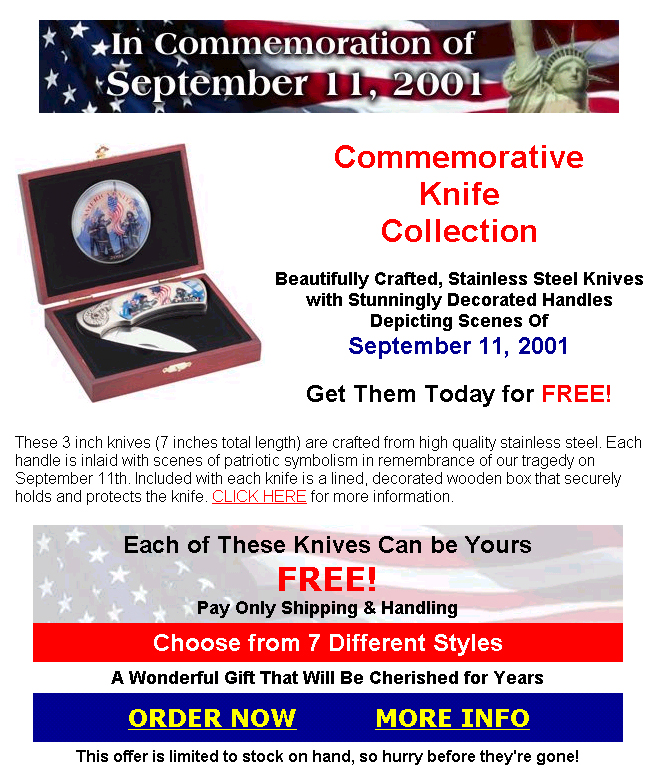 I just don't get the message behind this one. The terrorists have boxcutters; get a nice, patriotic boxcutter to defend yourself with.
